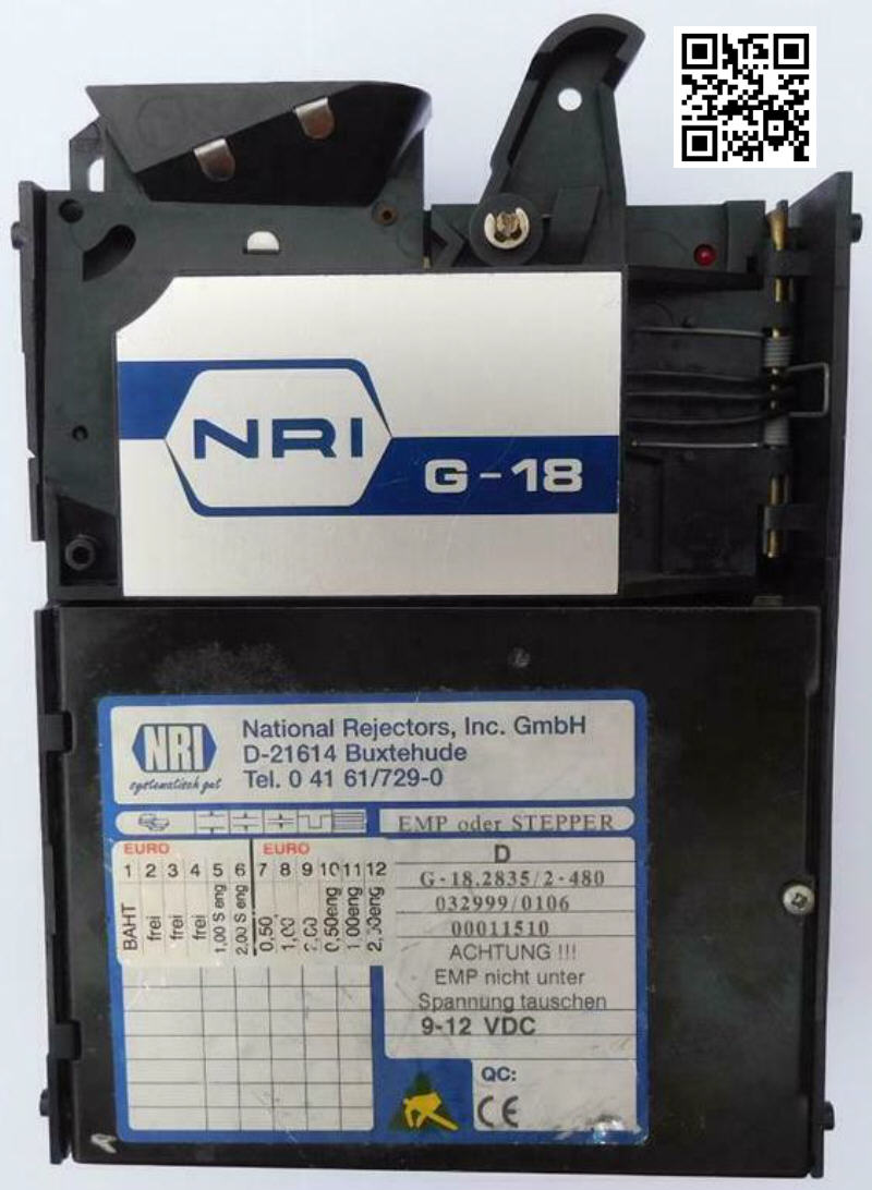 | Die G-18 Münzprüfer - Geräteserie des Herstellers N.R.I. aus Buxtehude begann mit den ersten 5 Zoll (5") breiten elektronischen Münzprüfern mit paralleler Schnittstelle (16-polige Stiftwanne), welche nicht nur Münzen oder Token / Wertmarken erkennen und den 6 elektrischen Leitungen zugeordnet werden können, sondern auch in verschiedene Schächte / Sortierschächte sortieren können - je nach Konfiguration (6-Kanal-Münzprüfer G-18.0551). Durch Weiterentwicklung wurde diese Modellreihe G-18.3000 mit Parallelanschluss optimiert und endete mit Modellen der Bezeichnung EMP (elektronische Münzprüfer) G-18.3603 als 12 Kanal Münzprüfer.